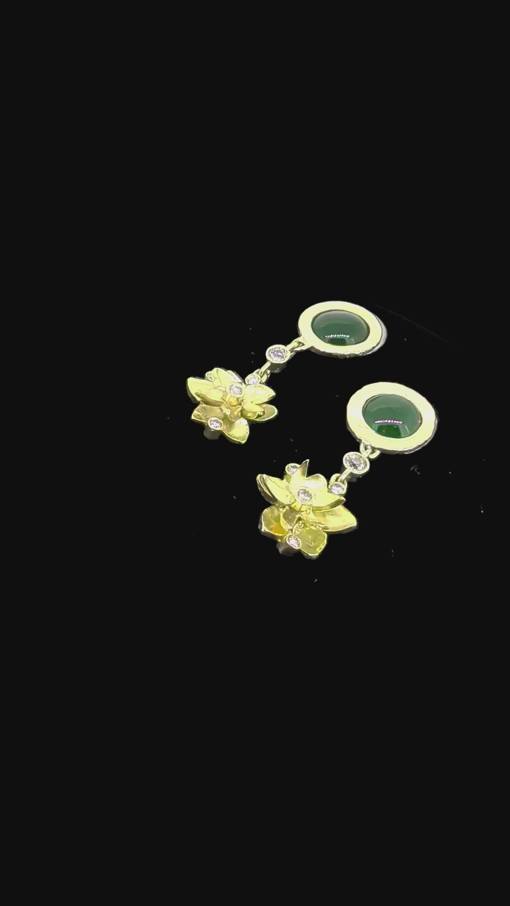 Completing the design, each lotus leaf is adorned with a beautifully polished AAA-quality jade stone, approximately 9mm round, bringing a sense of calm, harmony, and natural elegance to the piece. The contrast between warm gold, luminous diamonds, and serene jade creates earrings that are both meaningful and timeless.