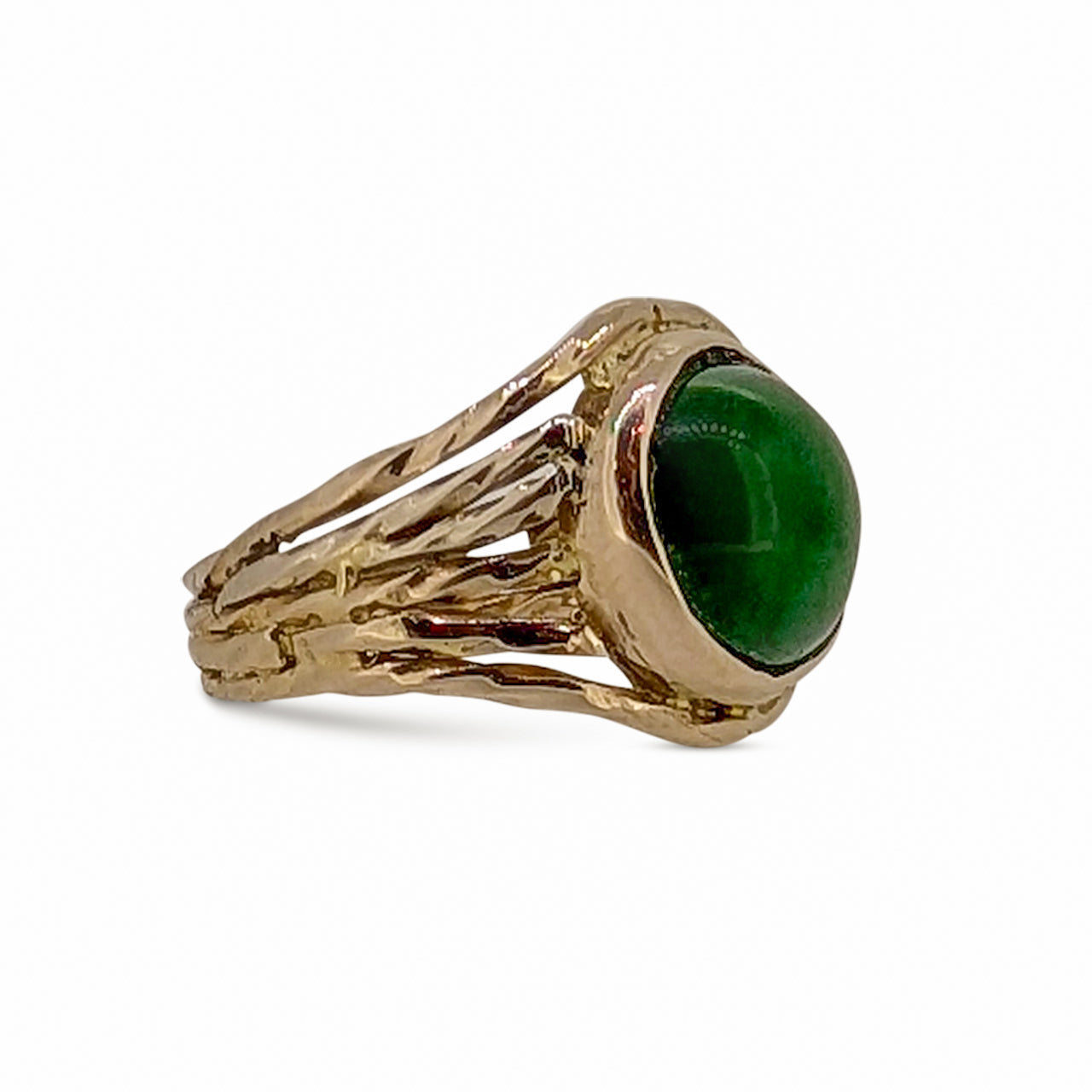 At its centre rests an exceptional AAA-quality jade, measuring approximately 10mm round. Carefully selected for its richness of tone and fine quality, the jade holds a natural depth and presence that elevates the piece beyond the ordinary. Its smooth, luminous surface offers a quiet strength, perfectly balanced by the warmth of the gold.