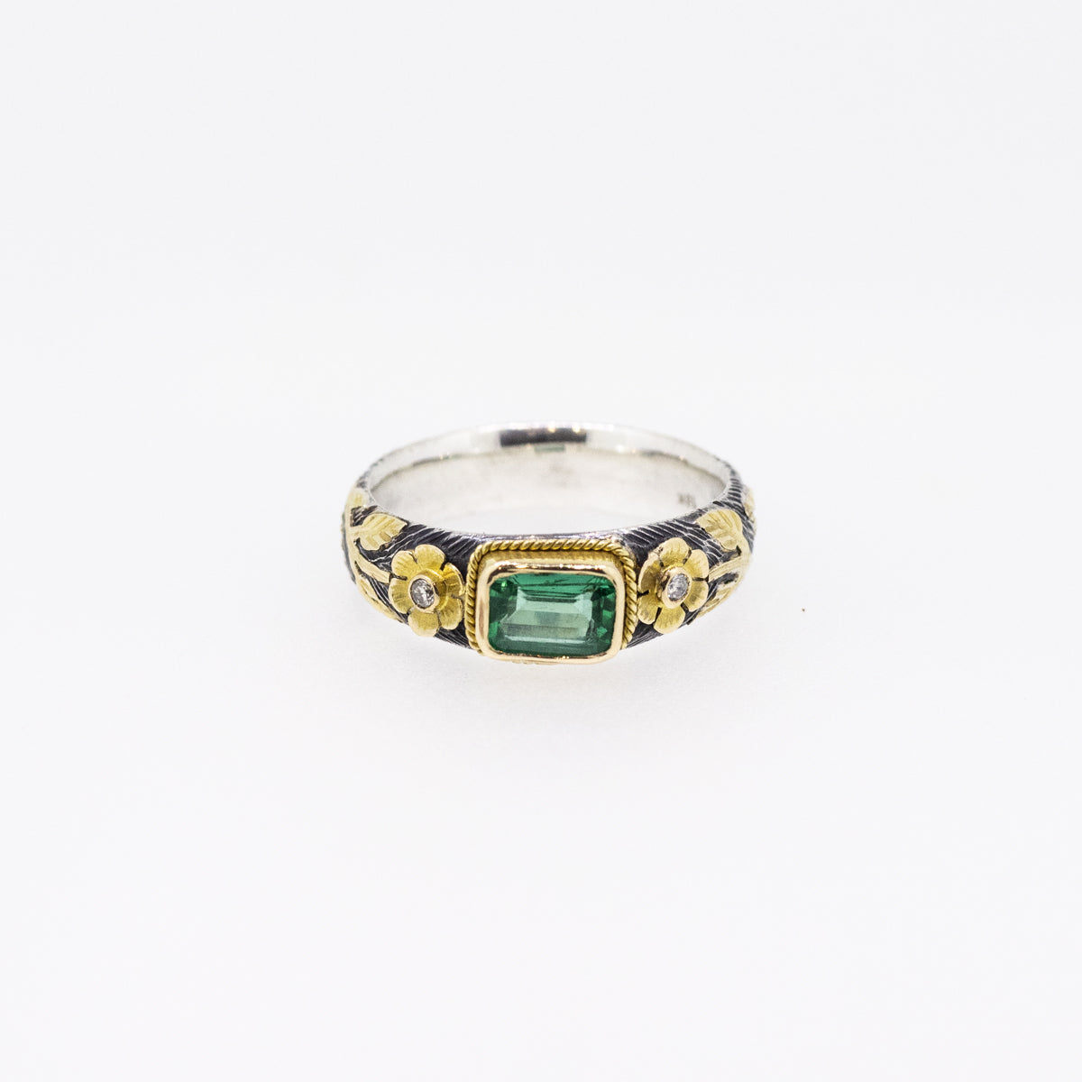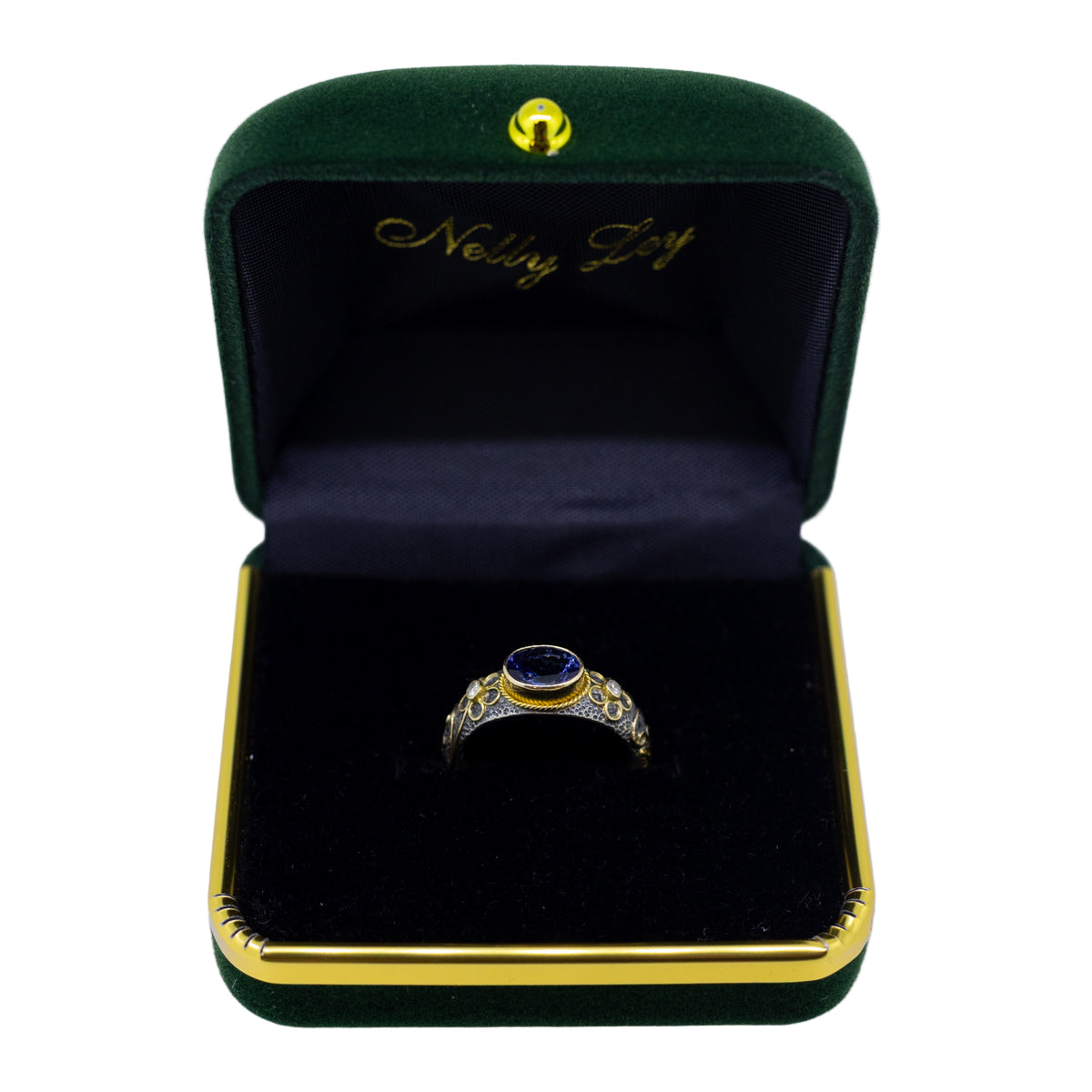 Tanzanite & Diamond Silver Ring with 18ct Gold Ornaments