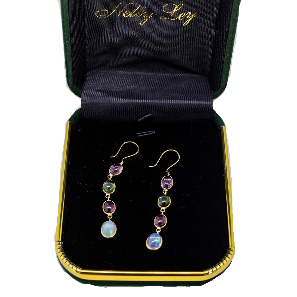 Unique and captivating, these Tourmaline and Opal Earrings are crafted in solid 18ct gold and set with a stunning 7.75ct of natural gemstones. The vibrant hues of tourmaline pair beautifully with the iridescent glow of opal at the bottom, creating a harmonious balance of colour and light.