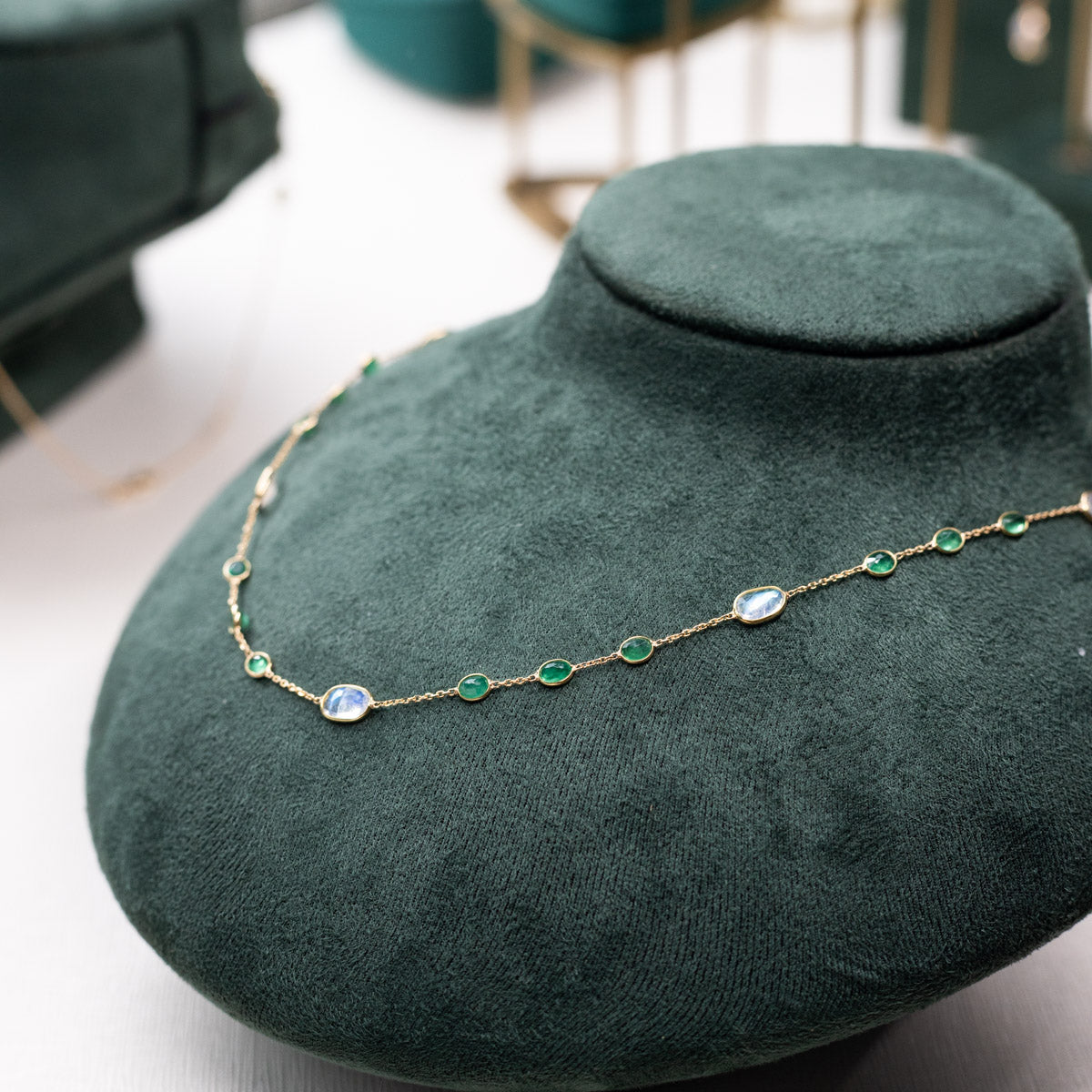 Ethereal and captivating, this Emerald & Moonstone Necklace is crafted in solid 18ct gold and set with approximately 16.5ct of natural moonstone. Its soft, luminous glow combined with the green tones of the emerald evokes a sense of elegance and mystique, making it a standout piece in any jewellery collection.